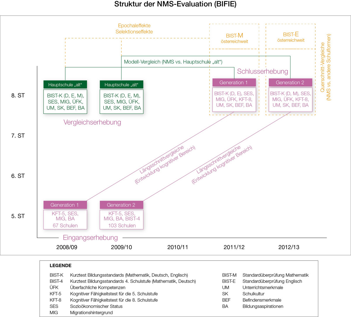 In der ersten Klasse der NMS wurden wichtige Lernvoraussetzungen erhoben. Diese Schülerinnen und Schüler wurden in einem echten Längsschnitt bis in die 4. Klasse begleitet und in ihrem letzten Schuljahr innerhalb der NMS mit den Instrumenten zur Überprüfung der Bildungsstandards sowie mit ergänzenden Instrumenten zur Erfassung überfachlicher Kompetenzen und schulbezogener Einstellungen und Verhaltensweisen getestet.